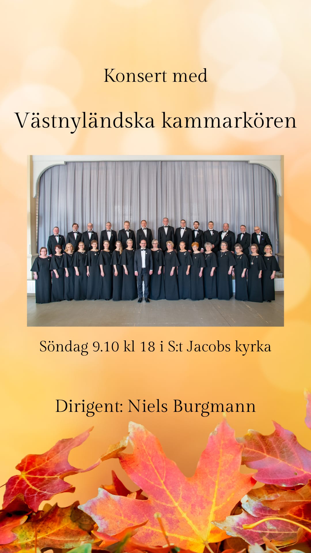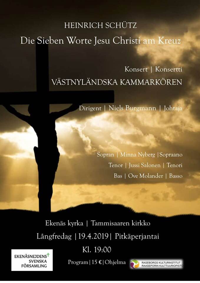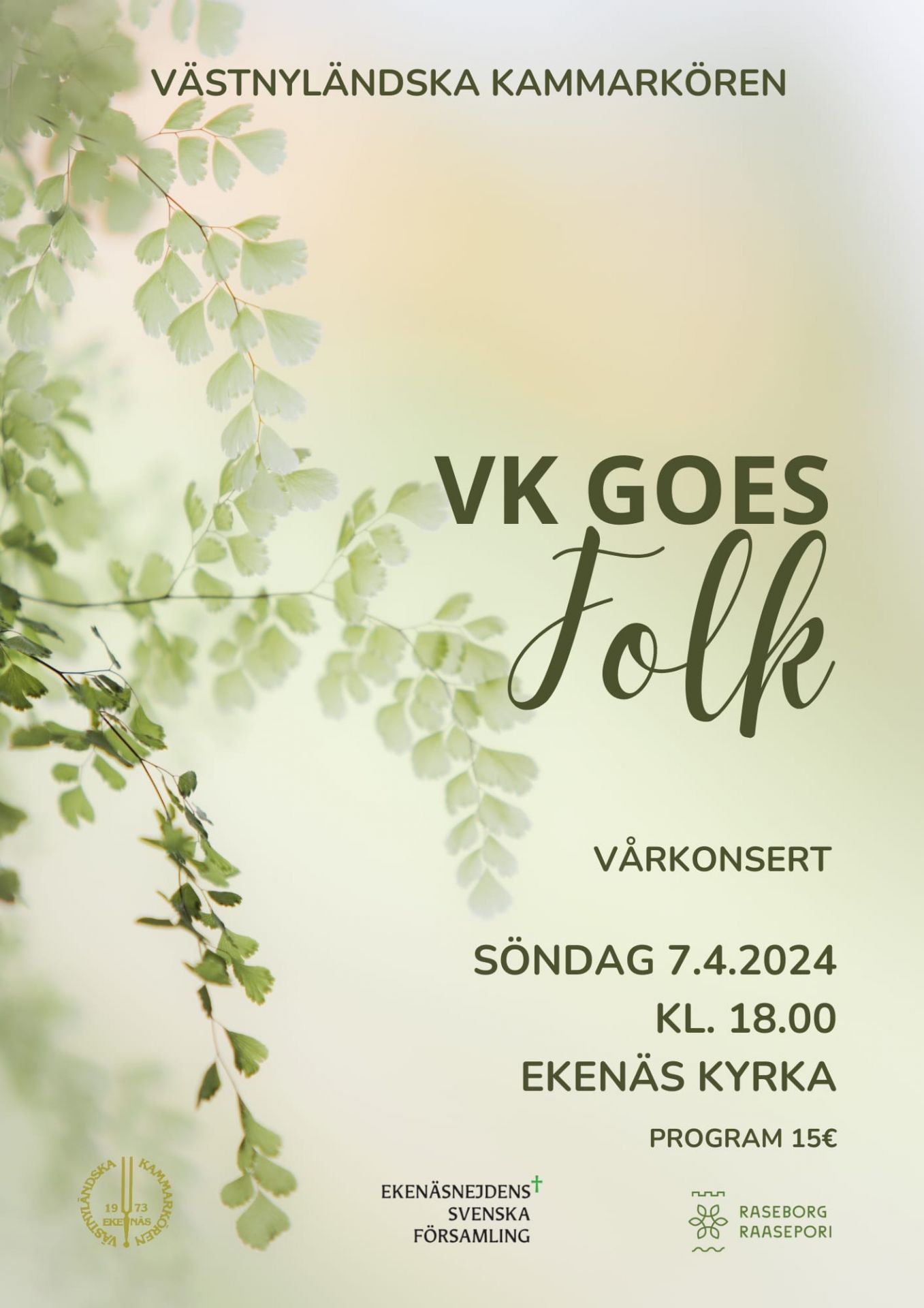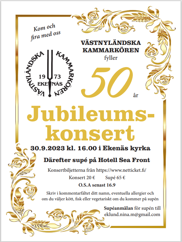 Västnyländska kammarkören ger konsert söndagen den 7.4.2024 kl. 18:00 i Ekenäs kyrka med Folkmusiktema. På programmet finns folkmusik från bl.a. Island, Sverige och Norge.