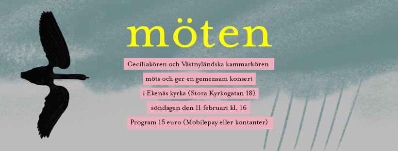 Välkommen på Västnyländksa Kammarkörens Midvinterkonsert i ekenäs kyrka den 12.2.2023 kl. 16:00. På programmet stycken av Mäntyjärvi, Whitacre, Nystedt, Gjeilo m.fl.