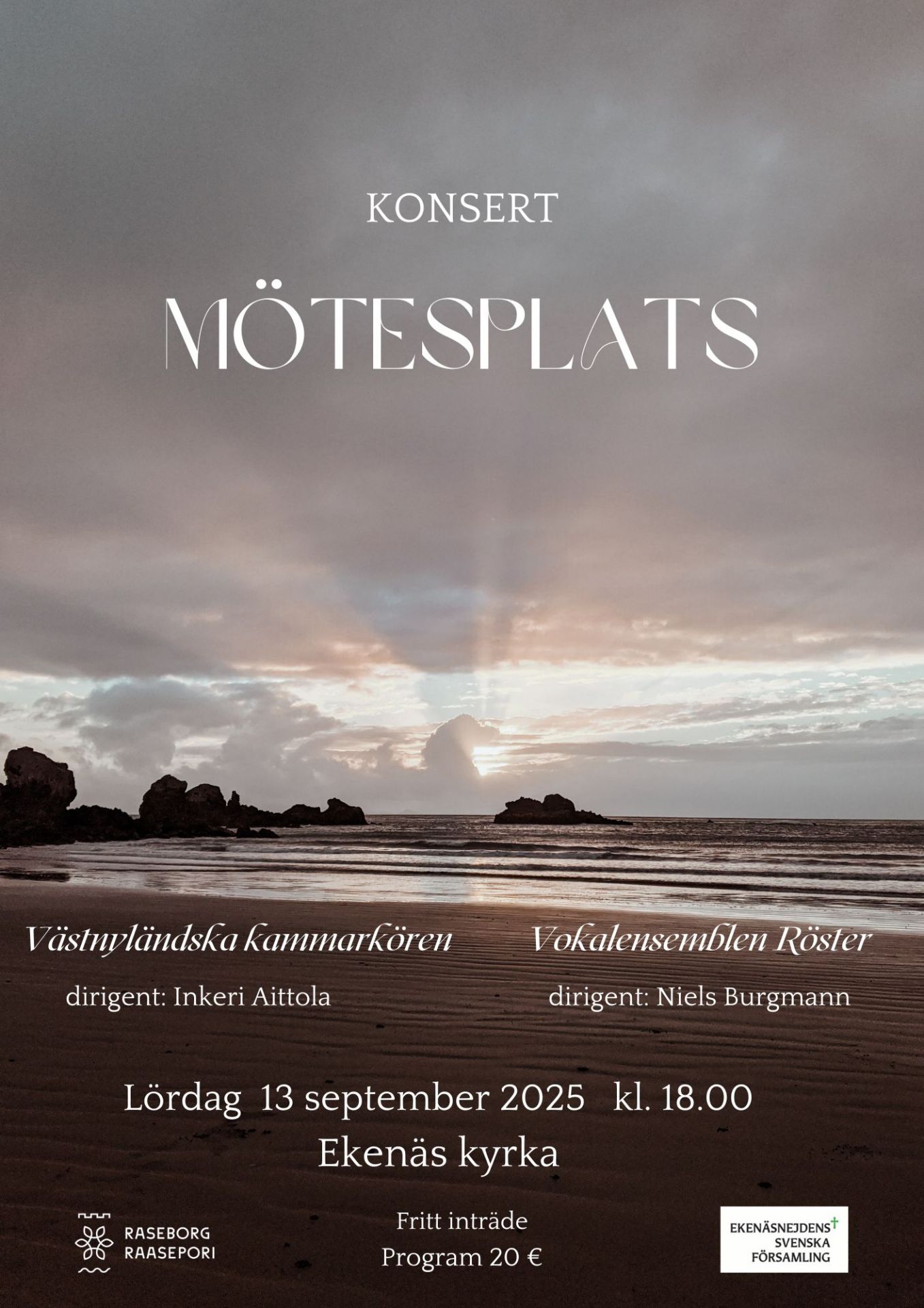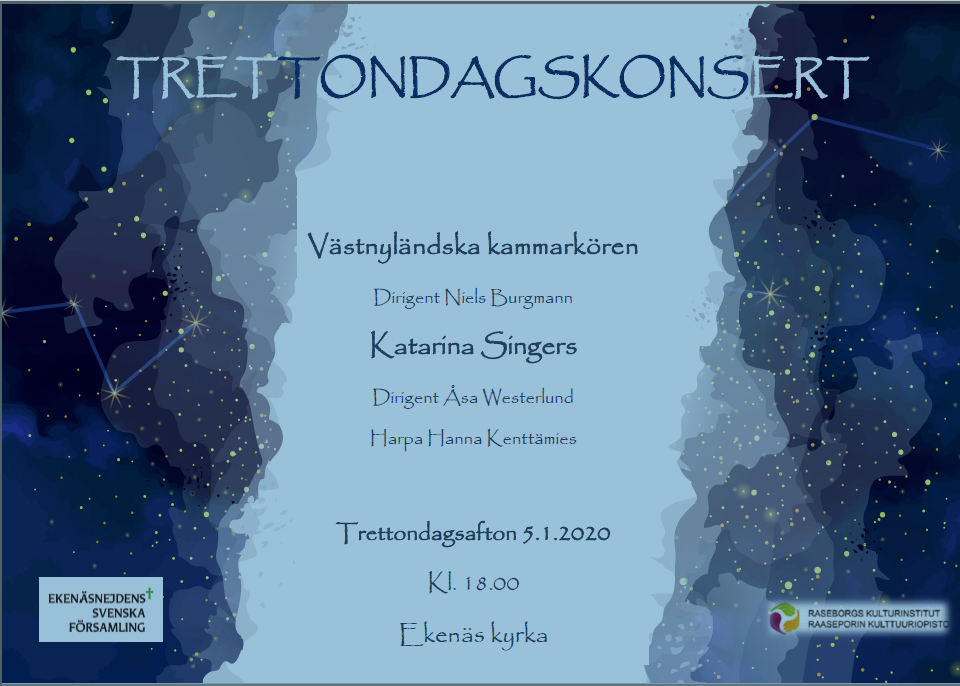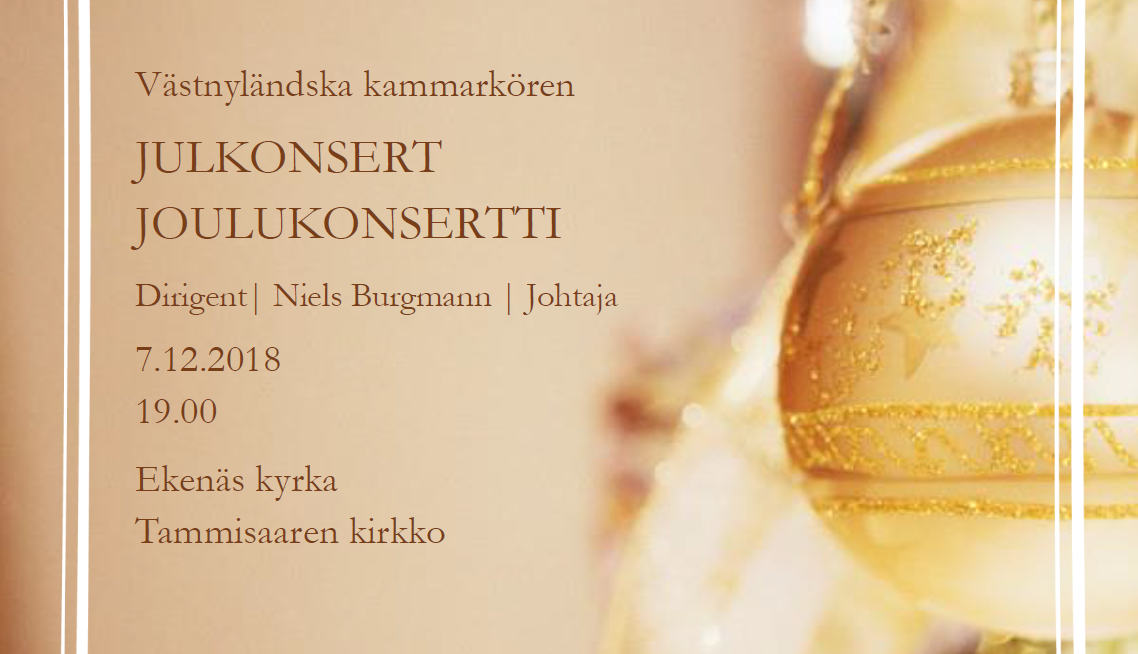 Välkommen på Västnyländksa Kammarkörens Midvinterkonsert i ekenäs kyrka den 12.2.2023 kl. 16:00. På programmet stycken av Mäntyjärvi, Whitacre, Nystedt, Gjeilo m.fl.